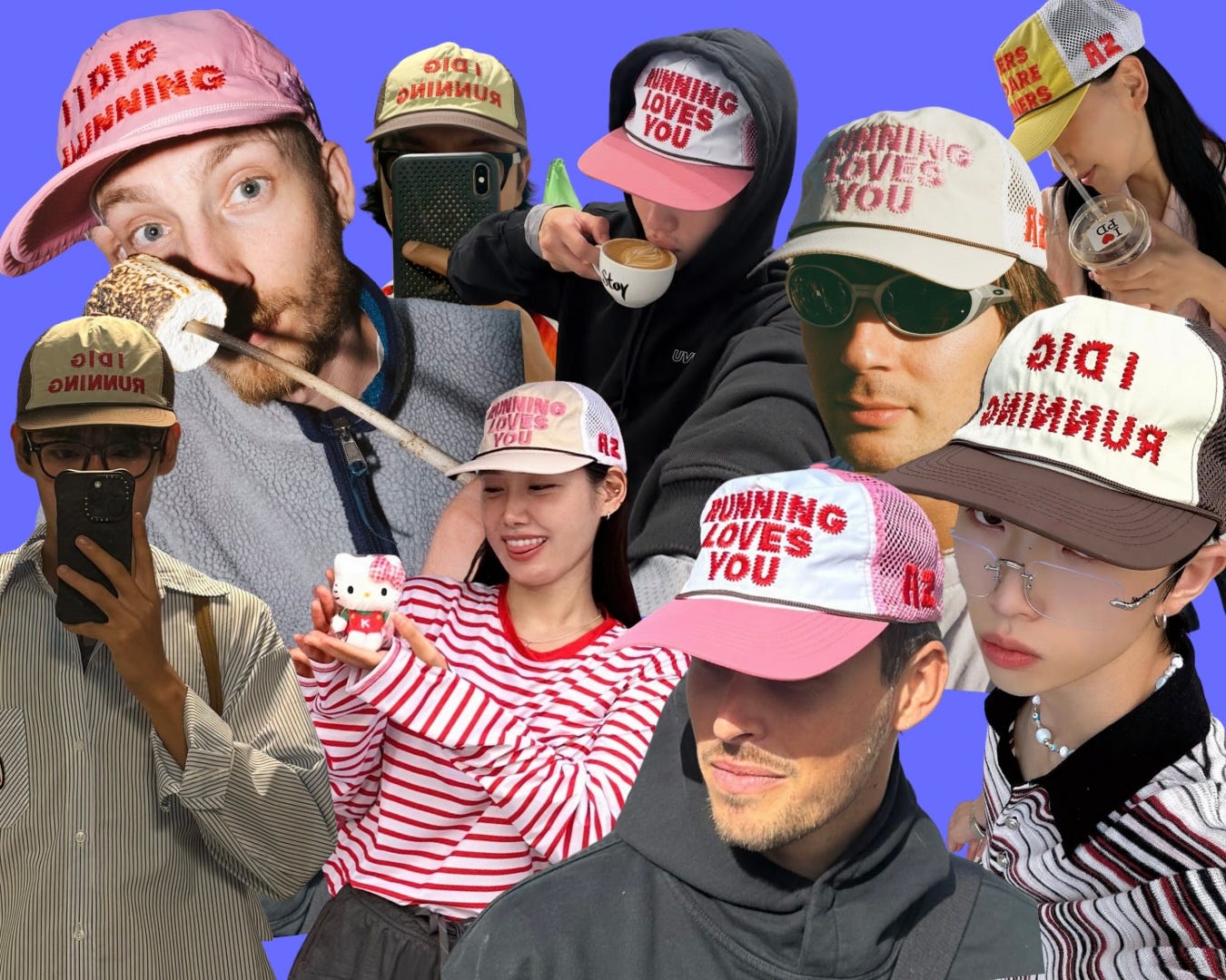 Why does he think they’re hitting the spot? “‘I Dig Running’ as a phrase is something people can identify with,” says Zono, who launched the caps last year. “I think of them like a band T-shirt but for running. It’s for people who are just into the sport.” The caps, which chime a lighthearted mood, give permission for people to not be ‘training’. They don’t look like a serious product; they’re expressive and individualistic. Run for fun, not performance, they seem to say. It’s a different message from recent years, with more and more people aiming for super fast race times; it’s not ‘Running Cult Member’ or ‘Just Do It’ either.